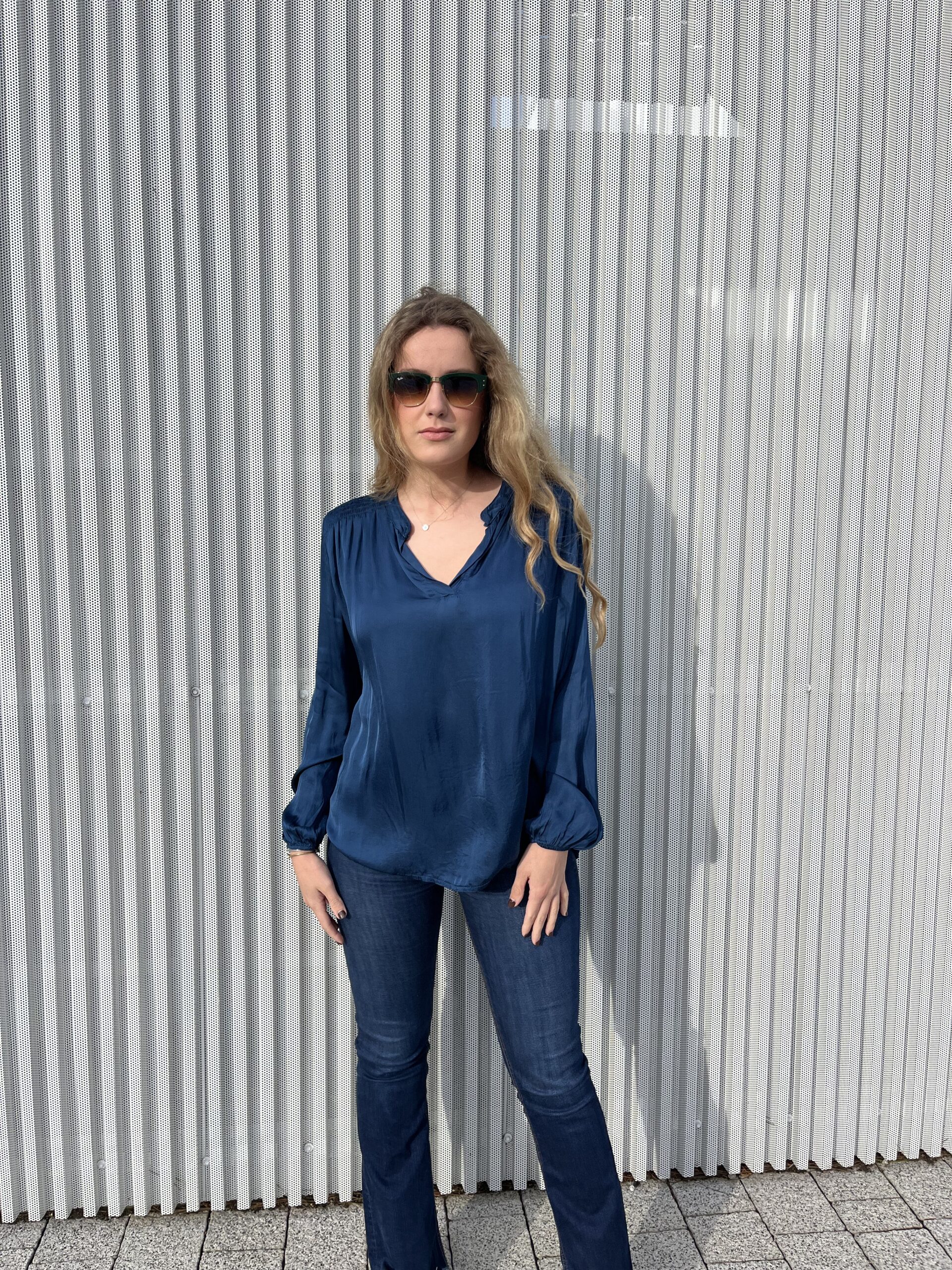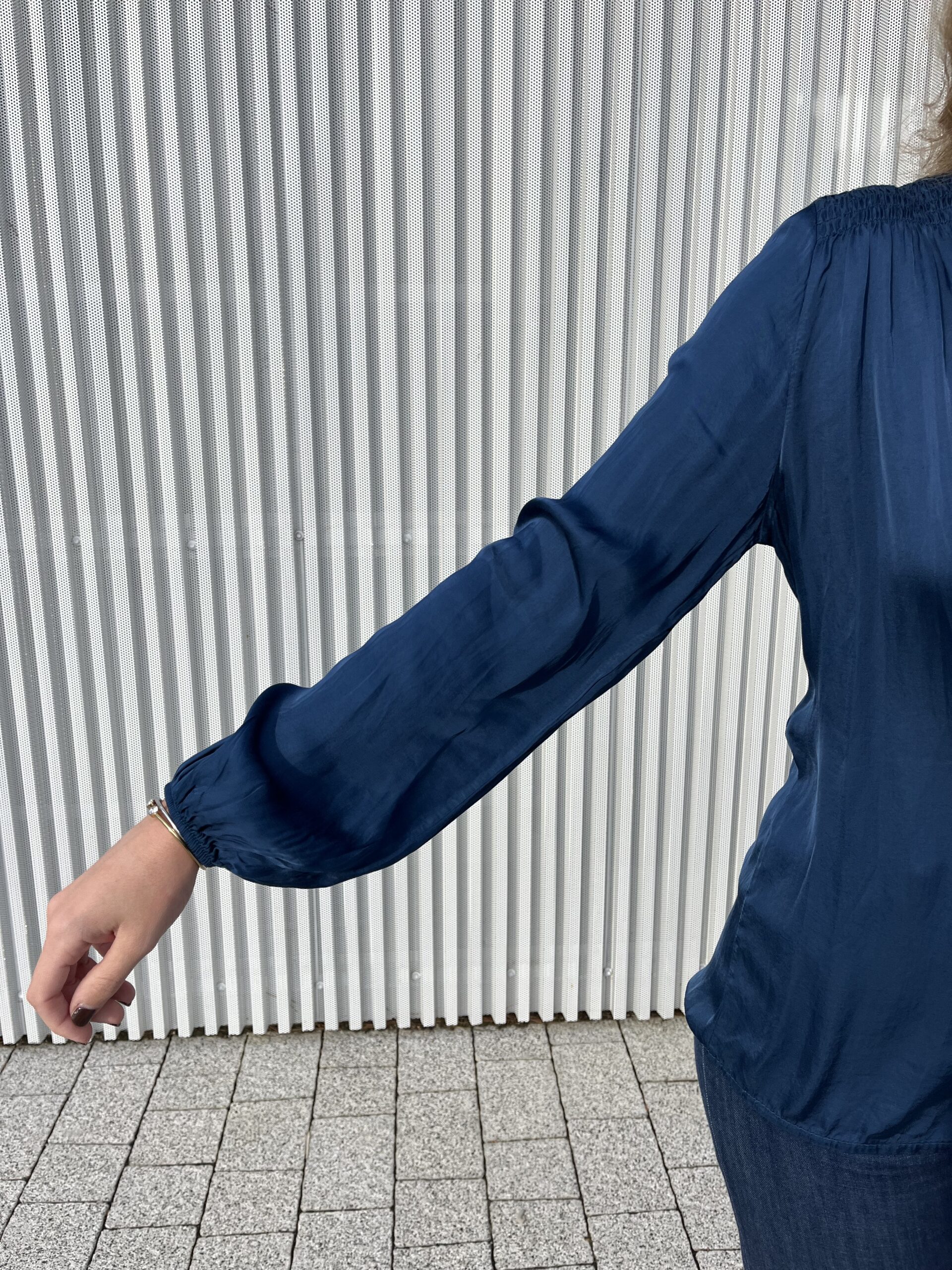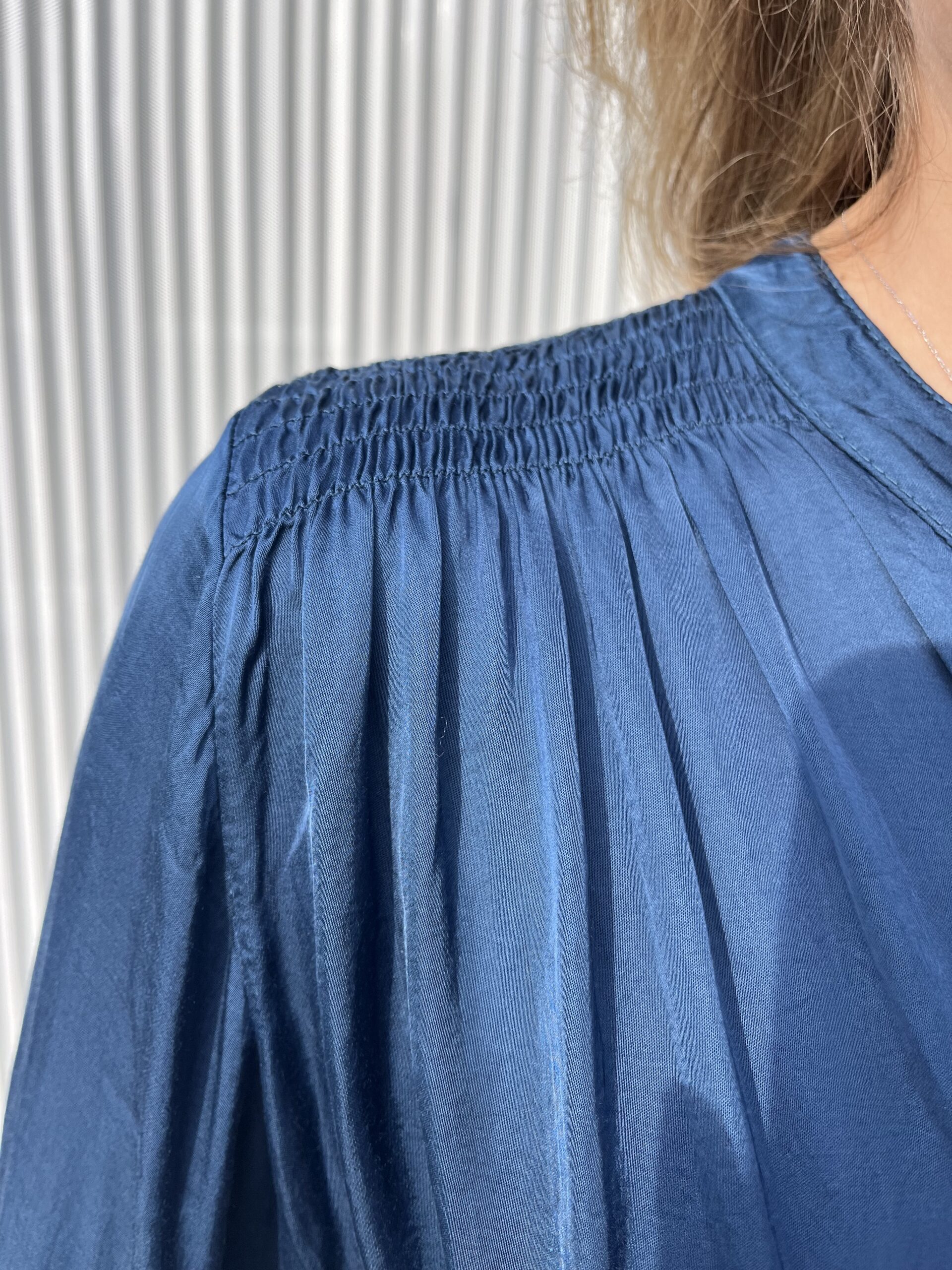 Etiquetas: azul, blusa, frunces hombro, lisa, manga larga, satinada