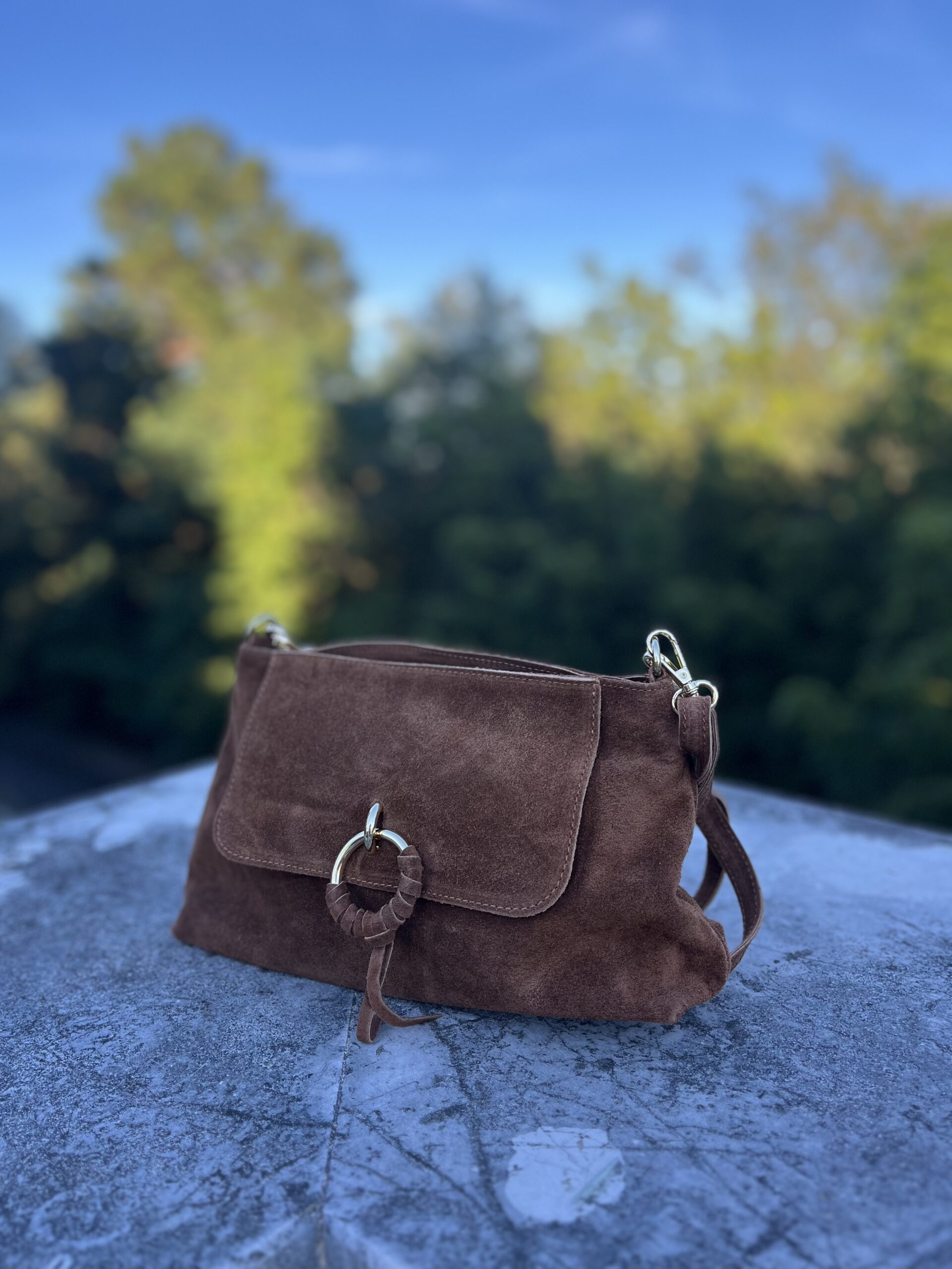 Con suficiente espacio para tus esenciales, este bolso de ante con detalle de aro dorado es una pieza que combina funcionalidad y estilo. Sin duda, se convertirá en un accesorio imprescindible en tu colección, perfecto para añadir un toque de sofisticación a cualquier atuendo. ¡Ideal para lucir fabulosa en cualquier ocasión!