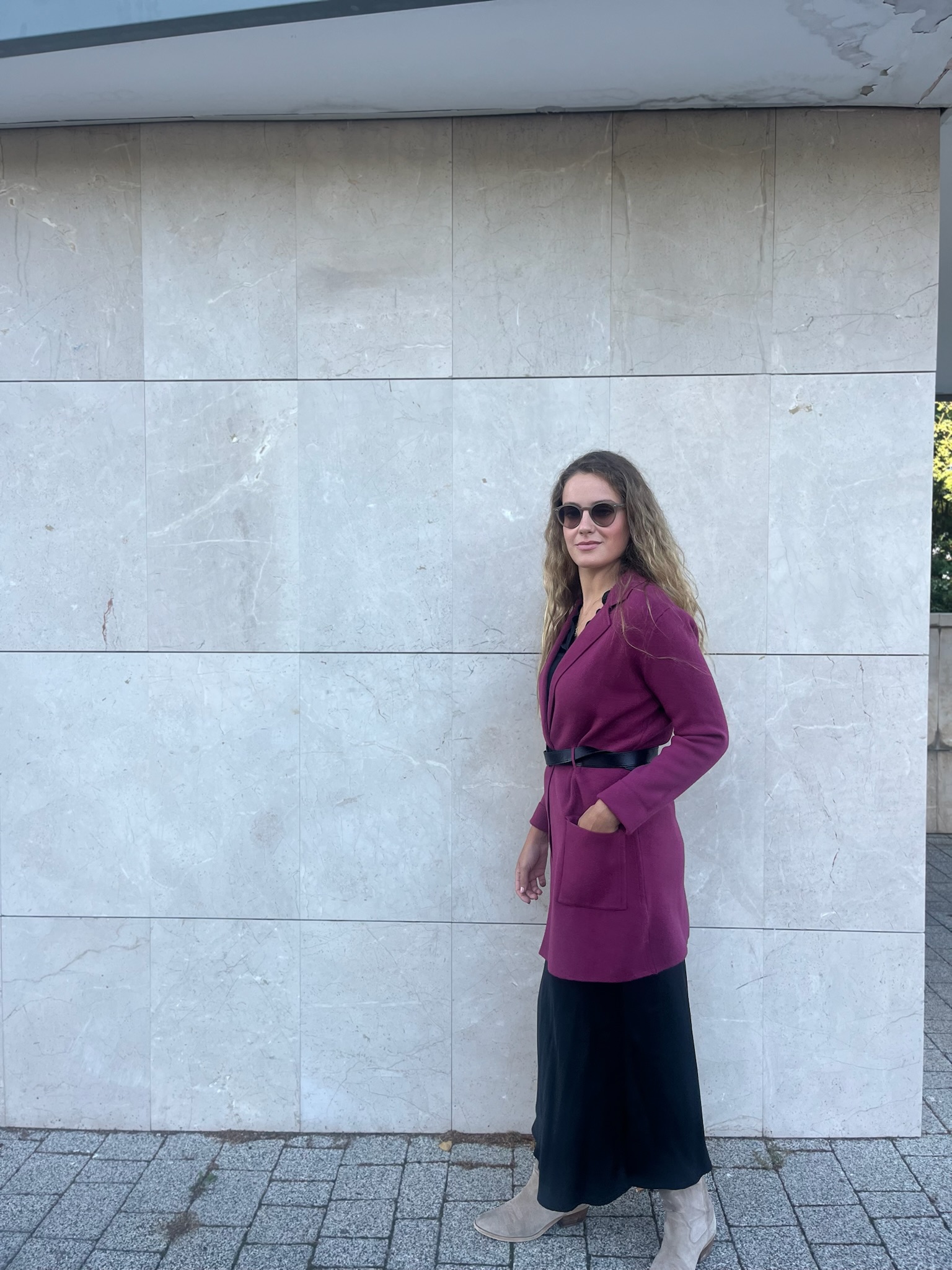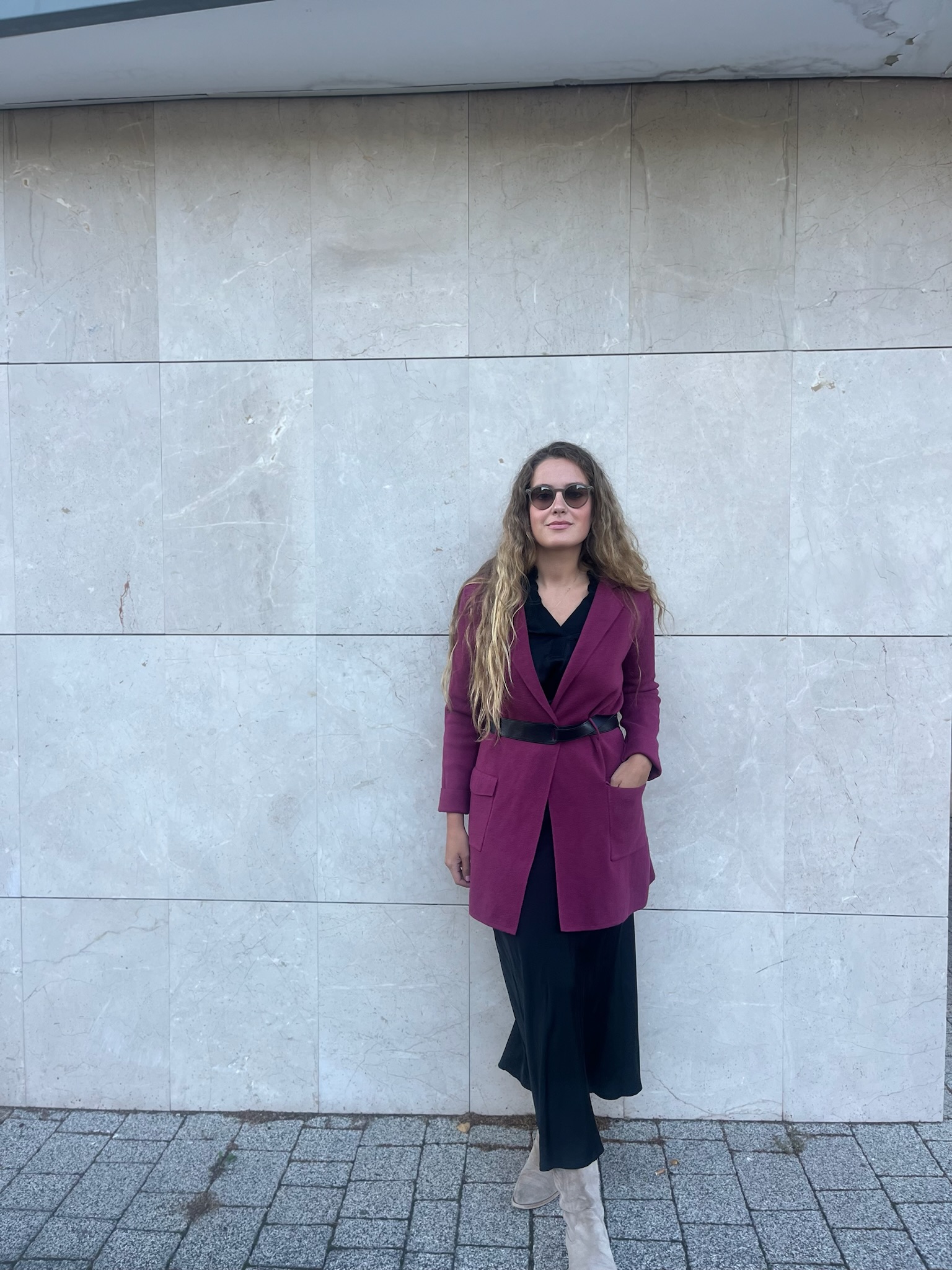 En cuanto a la paleta de colores, la chaqueta juega con un elegante contraste entre el negro, el crudo y el granate. El negro aporta un aire sofisticado, el crudo añade luminosidad y suavidad, mientras que el granate introduce un toque de color vibrante y cálido, esencial para este otoño. Esta combinación de colores hace que la chaqueta sea versátil y fácil de combinar con diferentes atuendos.