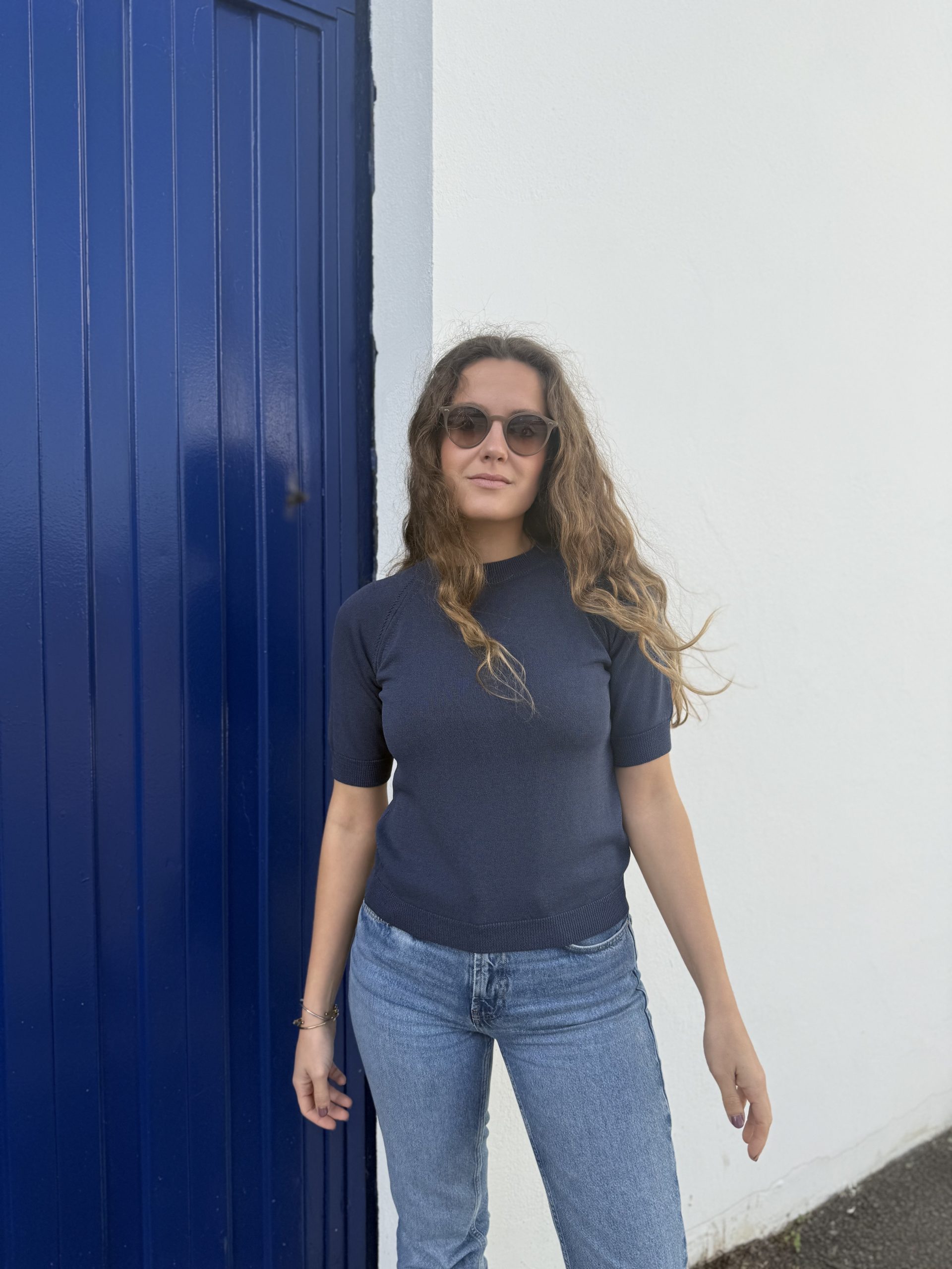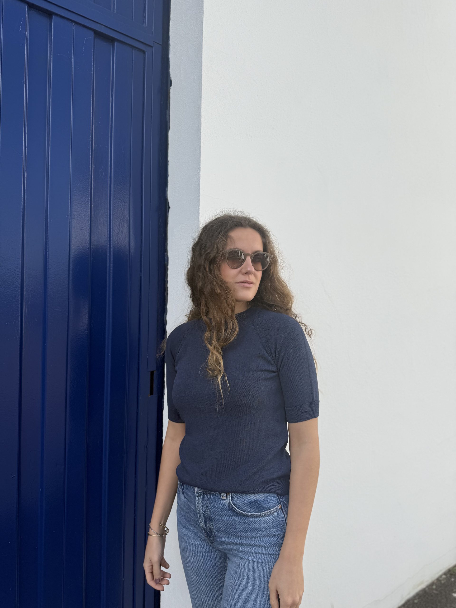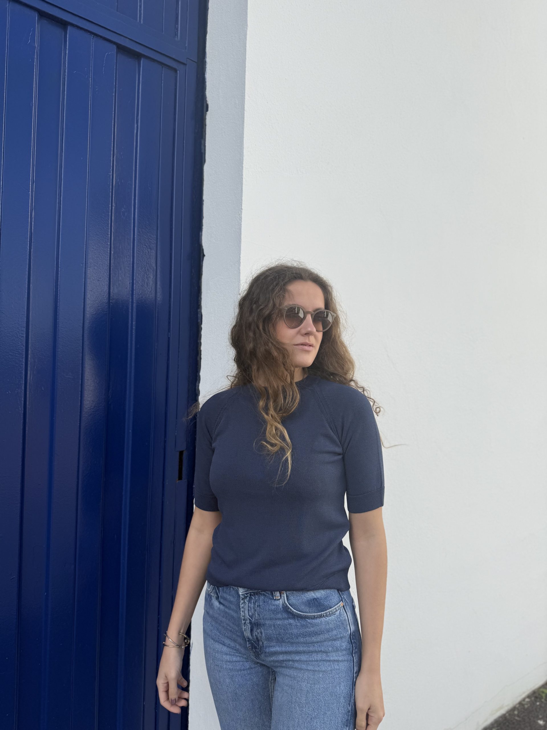 El top de punto azul marino de Imperio Norte es una prenda básica elevada, perfecta para construir looks elegantes y versátiles. Su diseño de punto aporta textura y confort, mientras que el escote redondo y la manga corta crean una silueta atemporal que favorece y combina con todo.